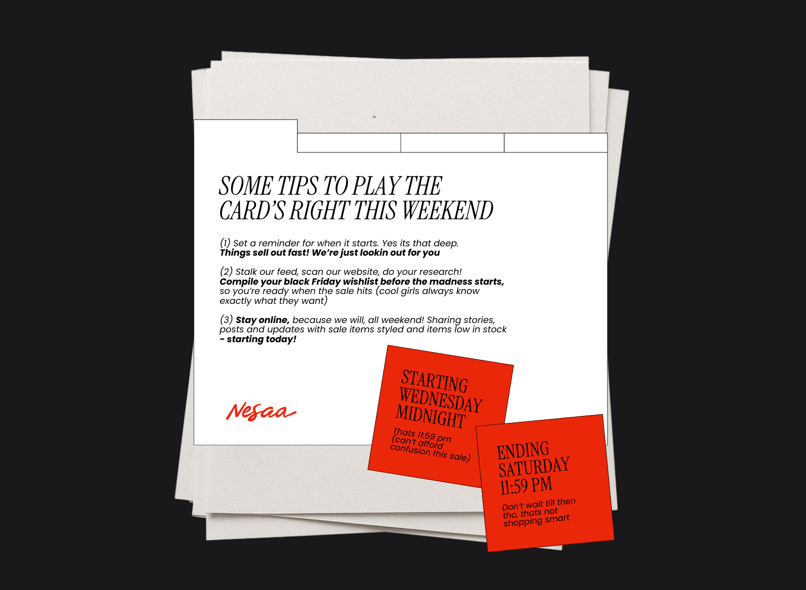 OUR BLACK FRIDAY TIPS (1) Be here on time. Yes its that deep. Things sell out fast! We're just lookin out for you (2) Stalk our feed, scan our website, do your research! Compile your black Friday wishlist before the madness starts ( cool girls always know exactly what they want ) (3) Stay online, because we will, all weekend! Sharing stories, posts and updates with sale items styled and items low in stock