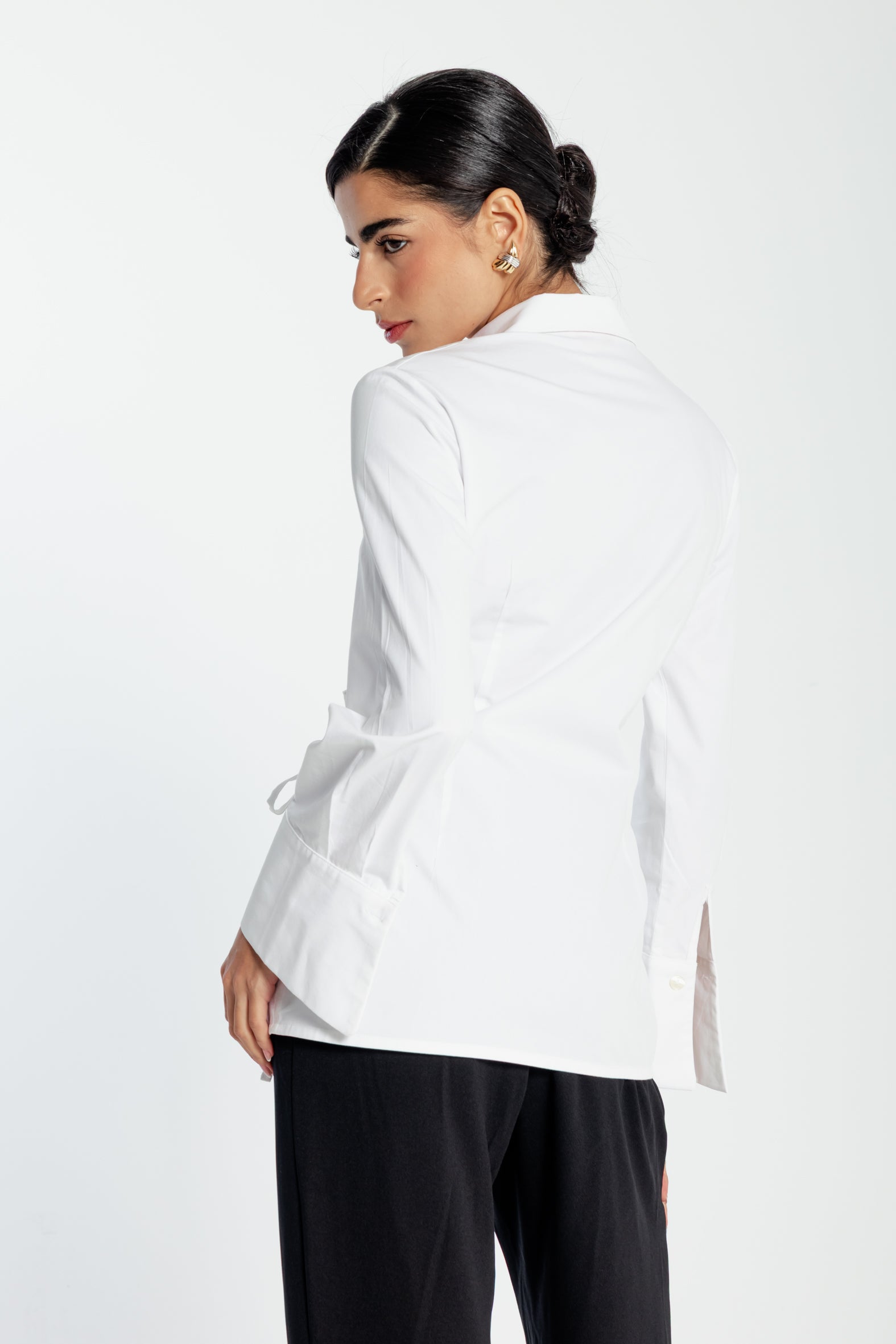 Classic collar, V-neckline, adjustable side tie closure, full-length sleeves, full-length sleeves with button cuffs