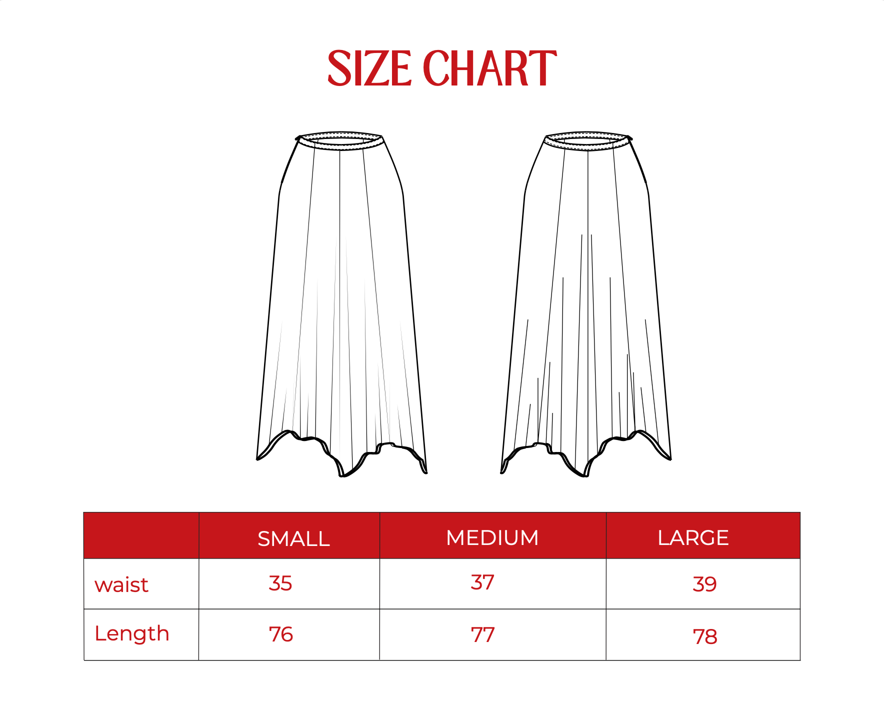 *Skirt length in size chart is measured from the shortest part of the asymmetric hemline.