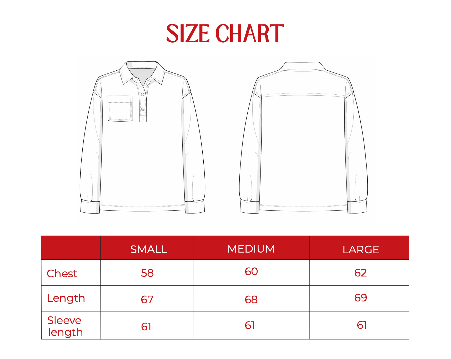 Our size chart lists half measurements of the actual garment.