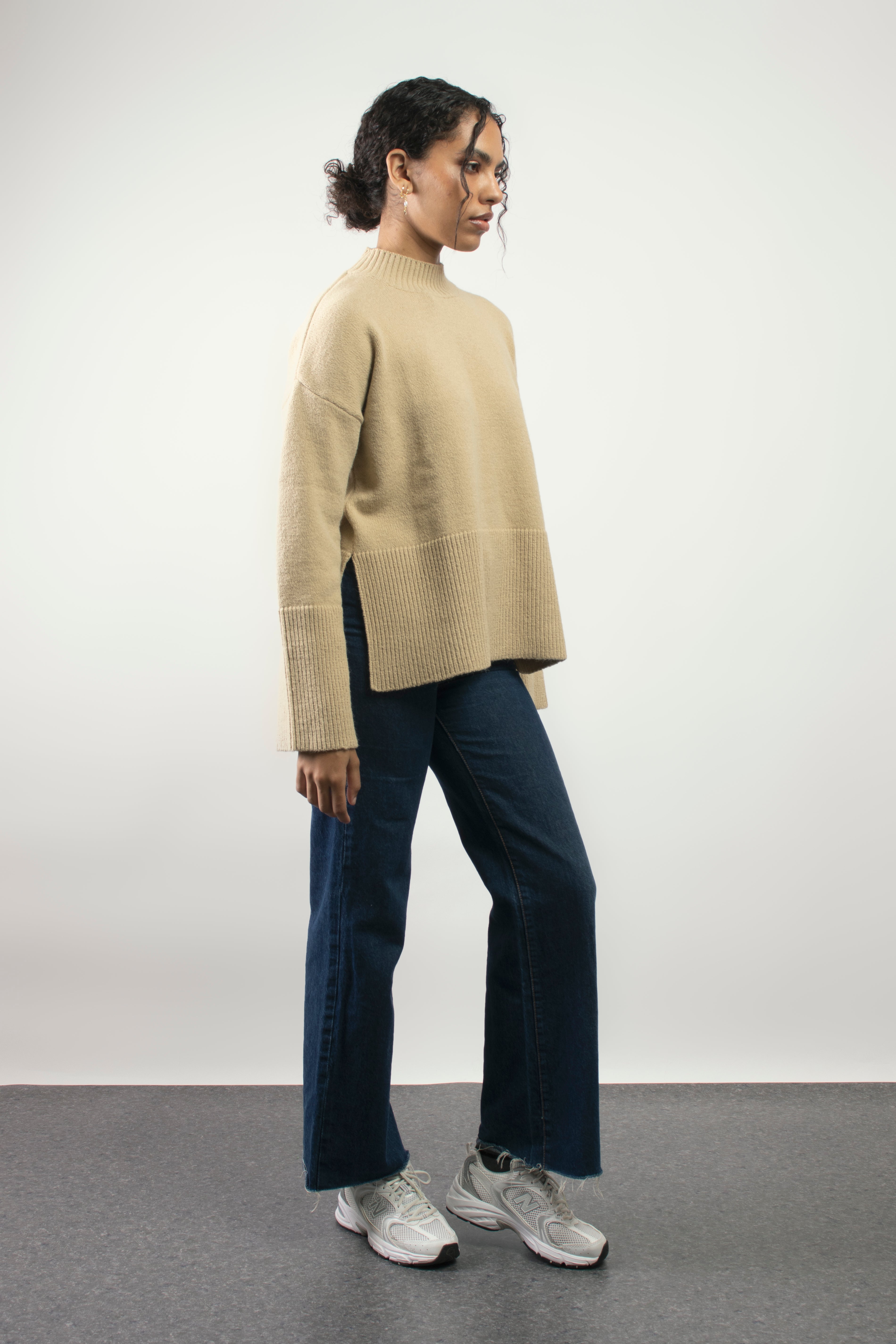 Features: Knit fabrication, high neckline, sleeves