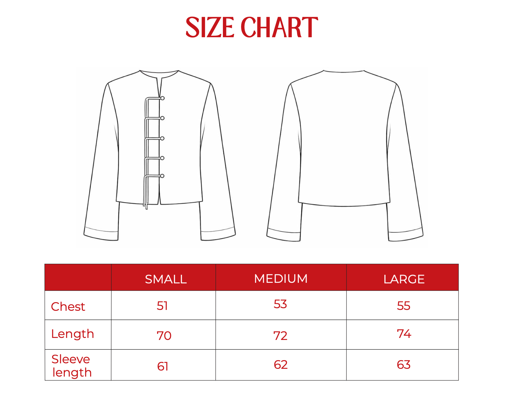 Our size chart lists half measurements of the actual garment.