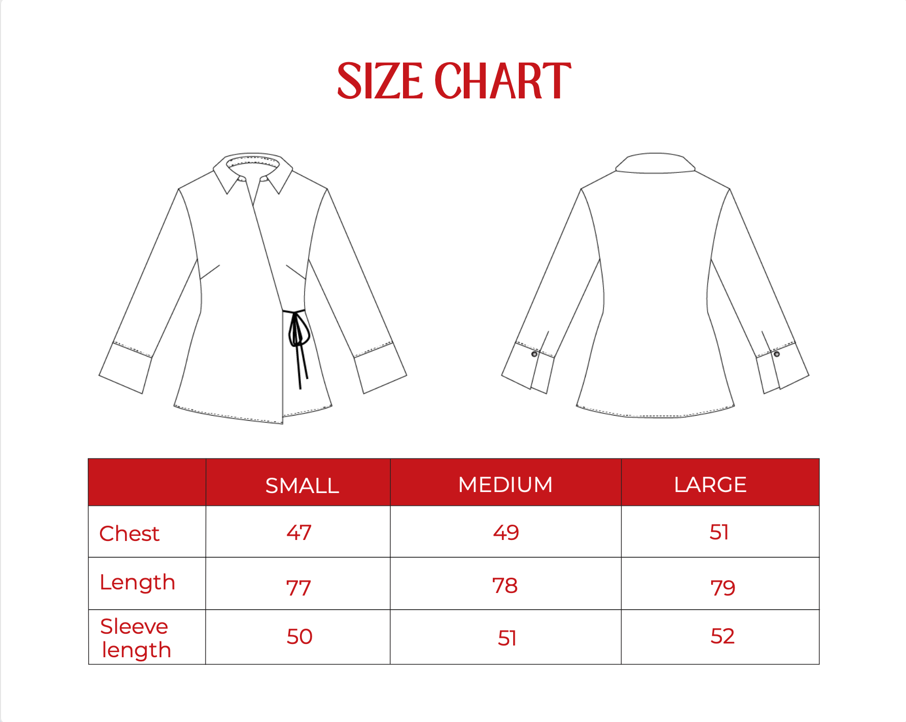 Classic collar, V-neckline, adjustable side tie closure, full-length sleeves, full-length sleeves with button cuffs