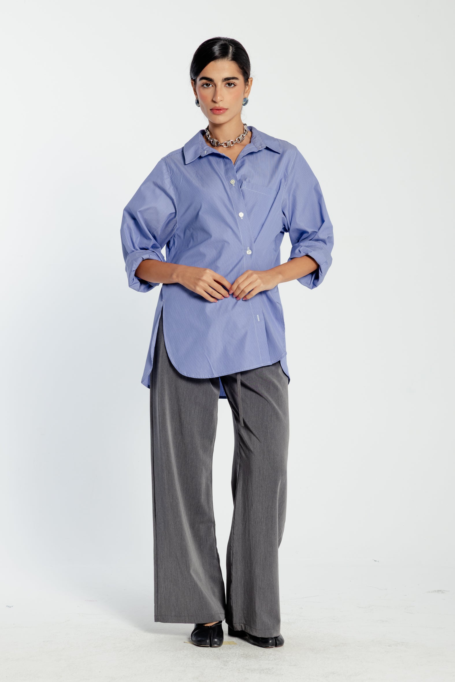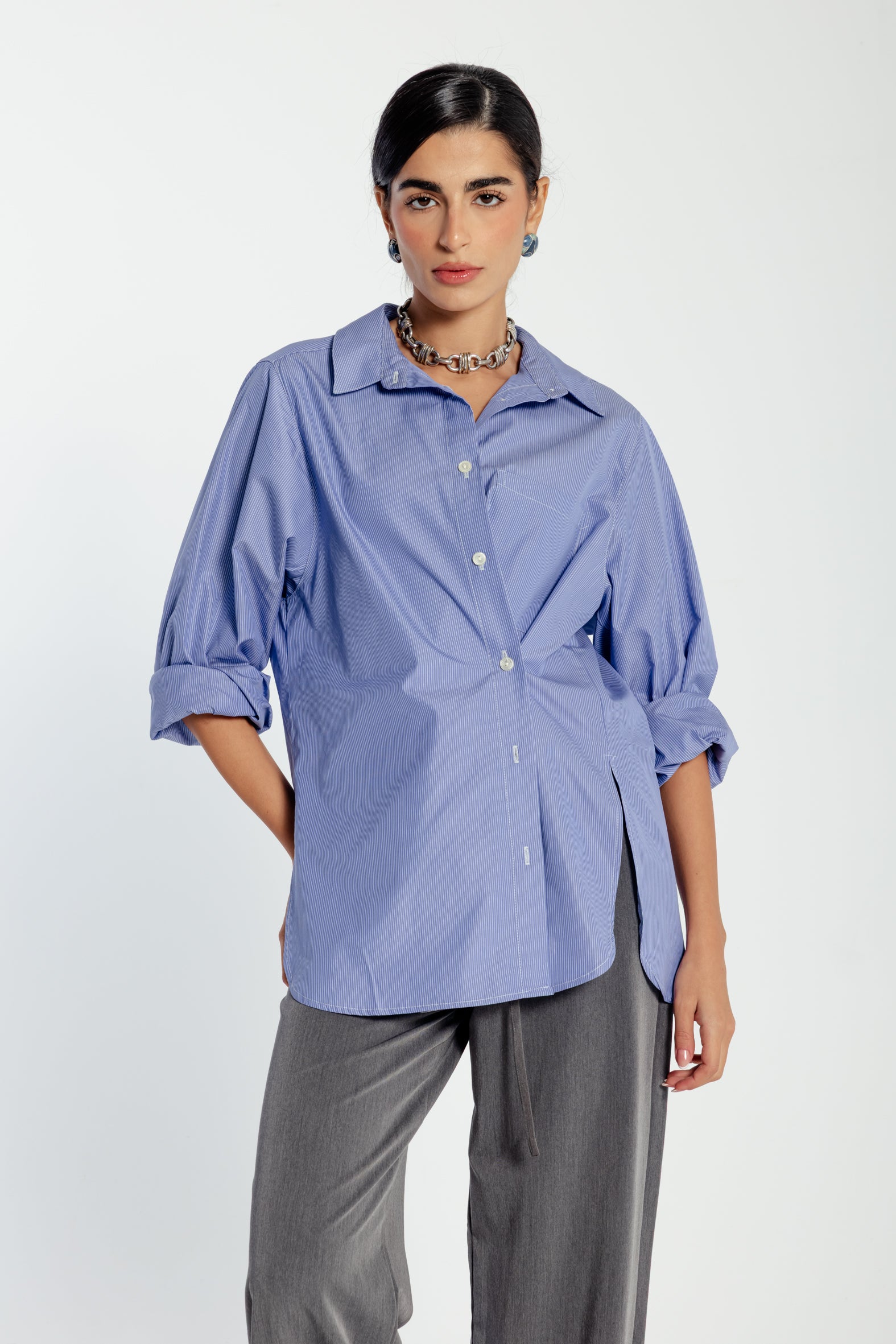 Relaxed silhouette — classic shirt with a modern asymmetric closure detail