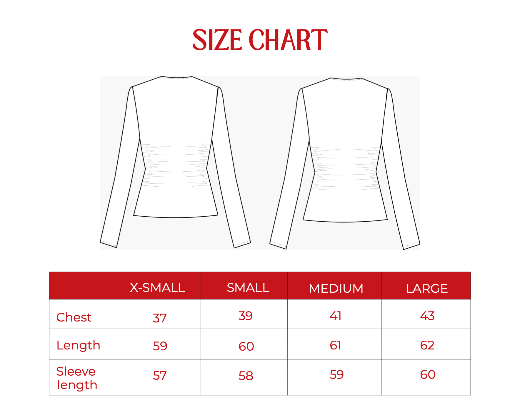 Round neckline, long sleeves, gathered detailing along the side seams for a ruched finish, straight hemline